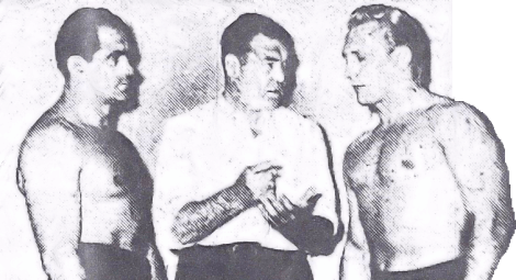 NWA Champion Lou Thesz and challenger Buddy Rogers receive instructions from former Boxing champion Jack Dempsey before a big title bout at Wrigley Field, Chicago in 1950.