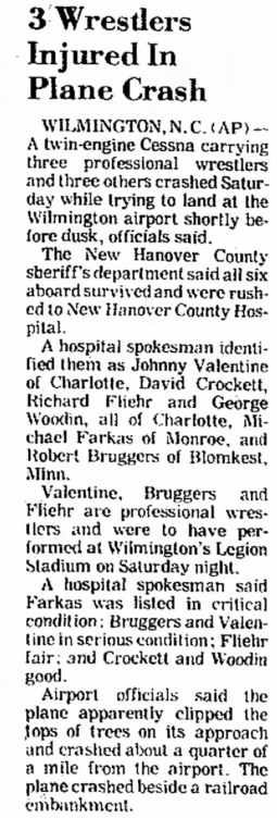 Flair was set to defend his title against Wahoo McDaniel in the Legion Stadium main event but he decided not to board the plane and hit the roads in his motor. Boarding the plane was Flair, the pilot Farkas, Valentine, “Mr. Wrestling” Tim Woods, Bob Bruggers and Jim Crockett’s son David. David Crockett’s brother Jimmy was supposed to board the plane instead of his brother but had fallen ill earlier that day.